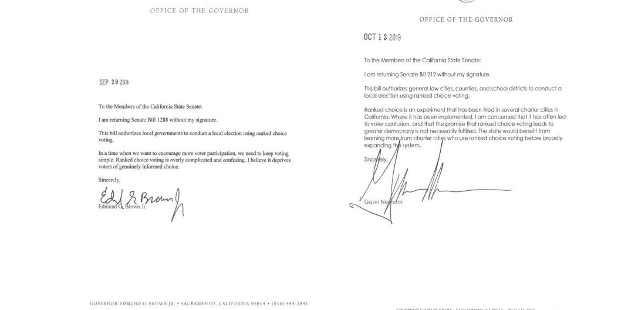 Governor Gavin Newsom in 2019 decided that RCV had already been tried in California, had led to VOTER CONFUSION and was not necessarily more "democratic".